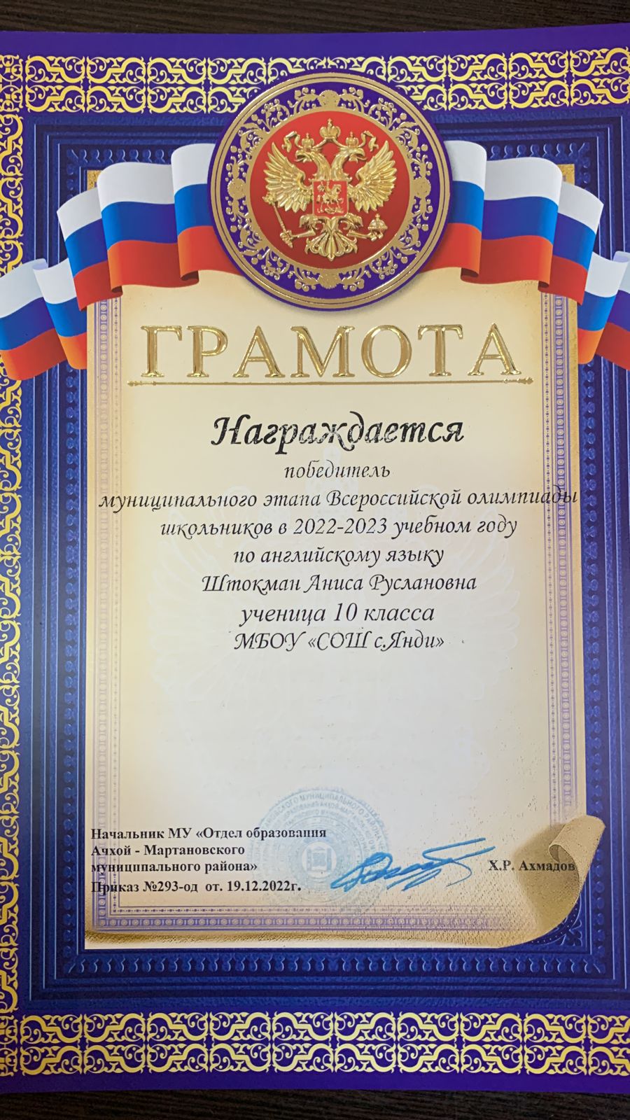 Ученица десятого класса Штокман Аниса Руслановна, выиграла муниципальный этап Всероссийской олимпиады школьников по Английскому языку.