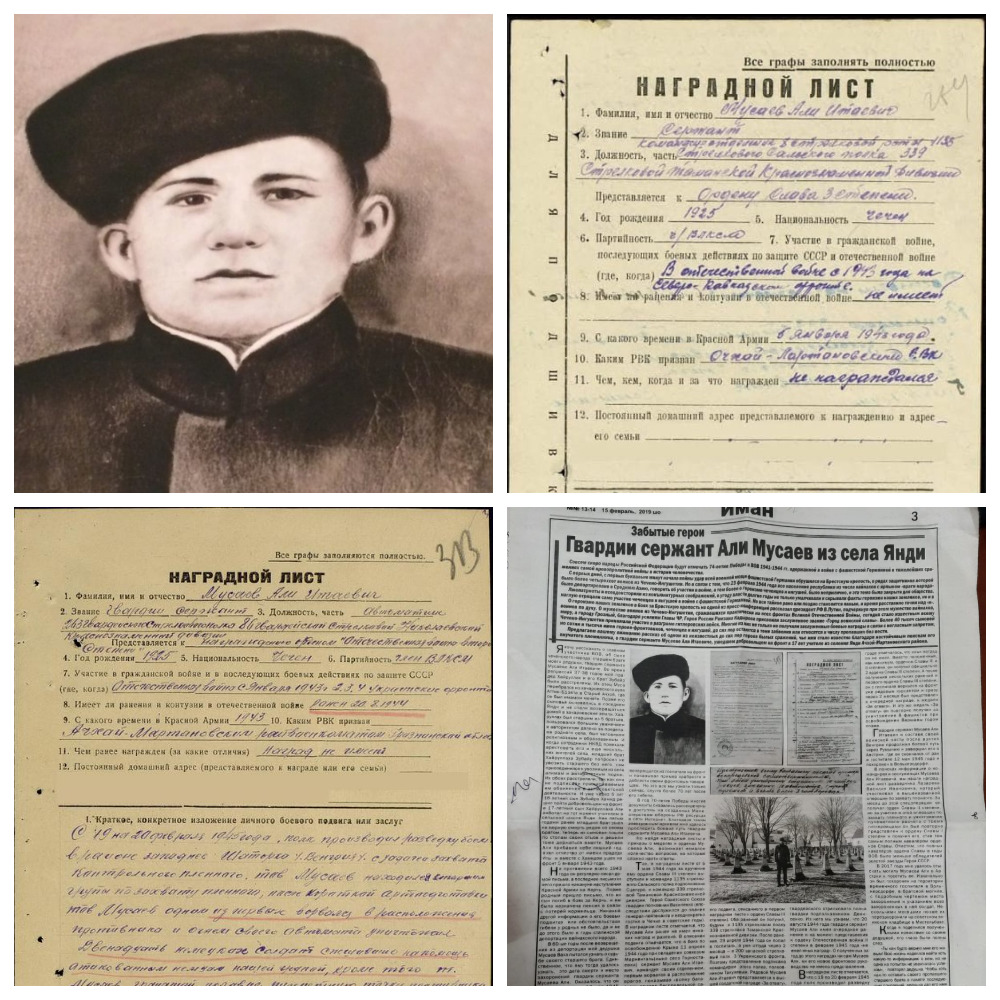 Мусаев Али Итаевич 5 января 1943 года ушел на фронт добровольцем и не вернулся больше домой. На тот момент ему было всего 17 лет, но так как в те годы в горных и предгорных селах ЧИАССР было мало грамотных людей, он уже работал школьным учителем в селе Янди Ачхой-Мартановского района. Когда на фронт добровольцами уходили его старшие двоюродные братья и односельчане, он прибавил себе лишний год и тоже отправился вместе с ними.