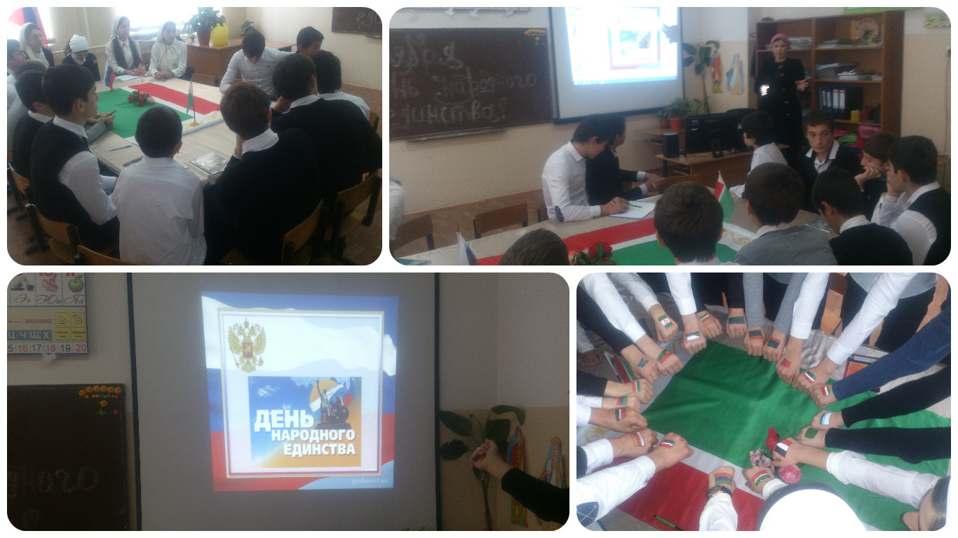 Классными руководителями 5-11 классов был проведен конкурс рисунков «Единый народ», а также для учеников 5-11 классов были проведены классные часы на тему «Если народ един, он непобедим!». Целью данных классных часов являлось: – познакомить обучающихся с историей праздника; – воспитывать чувство патриотизма, любви к Родине. Учителями русского языка и литературы был проведен конкурс сочинений среди обучающихся 9-11 классов на тему \"Если народ един, он непобедим\" В ходе мероприятий обучающиеся познакомились с историей возникновения праздника, подвигами наших предков во имя независимости Родины.