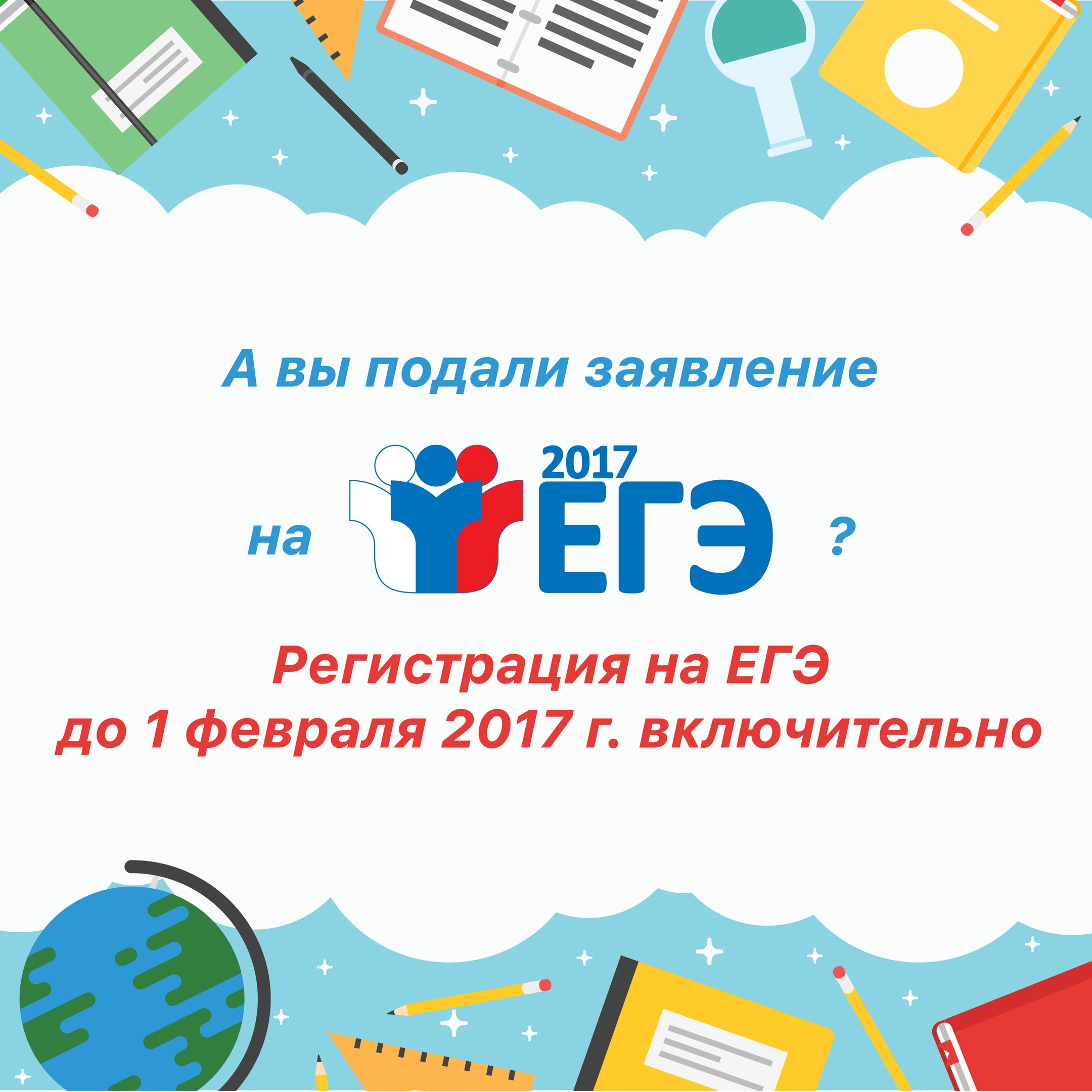 Федеральная служба по надзору в сфере образования и науки напоминает, что заявление на участие в ЕГЭ 2017 года необходимо подать до 1 февраля (включительно). В заявлении должны быть перечислены предметы, по которым участник планирует сдавать ЕГЭ.