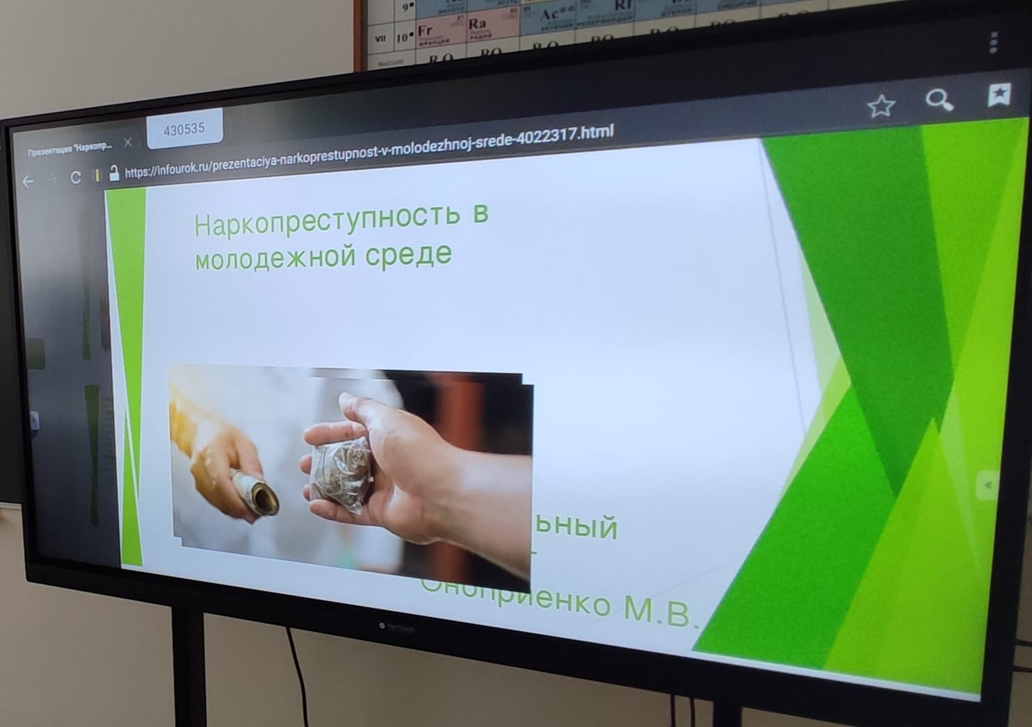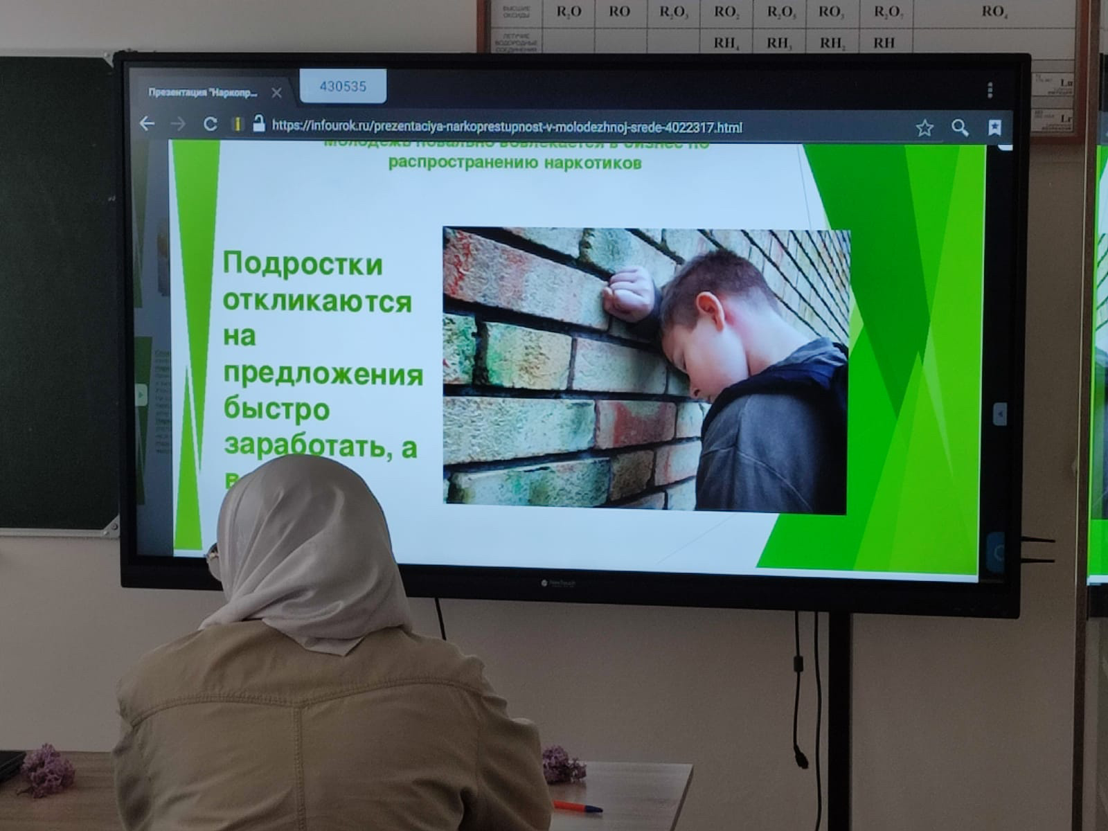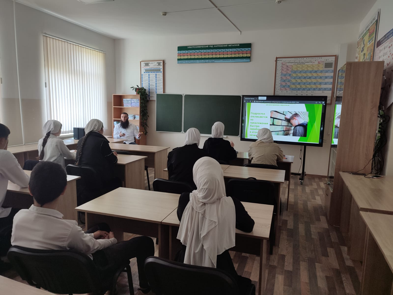 Педагог-организатор по ДНВ Идигов М.Л. провел беседу с обучающимися 9-11 классов. Основной целью беседы является предупреждение распространения наркомании среди несовершеннолетних, выявления факторов вовлечения их в преступную деятельность, связанную с незаконным оборотом наркотических средств и психотропных веществ.