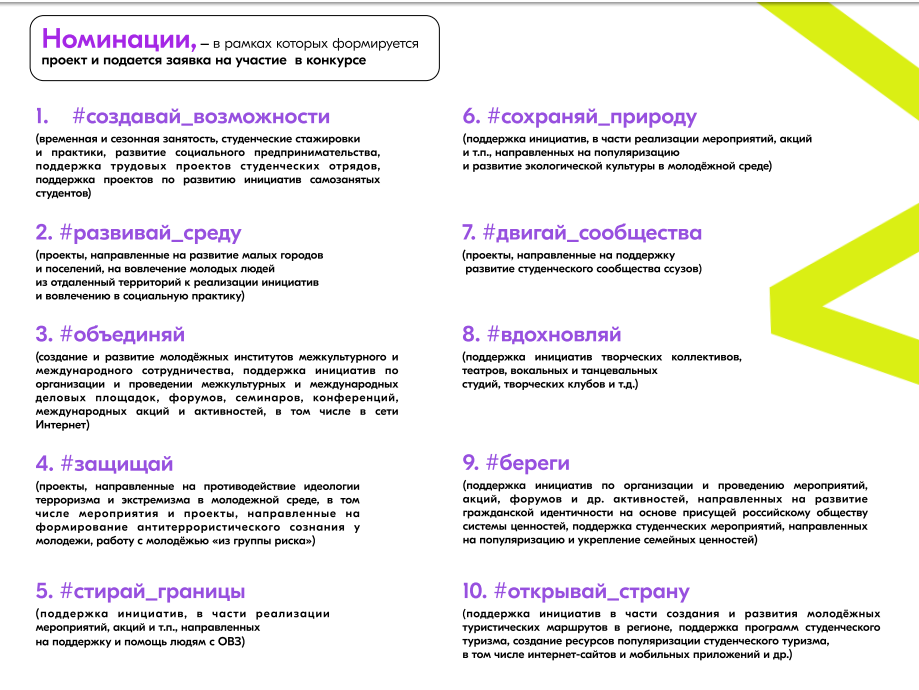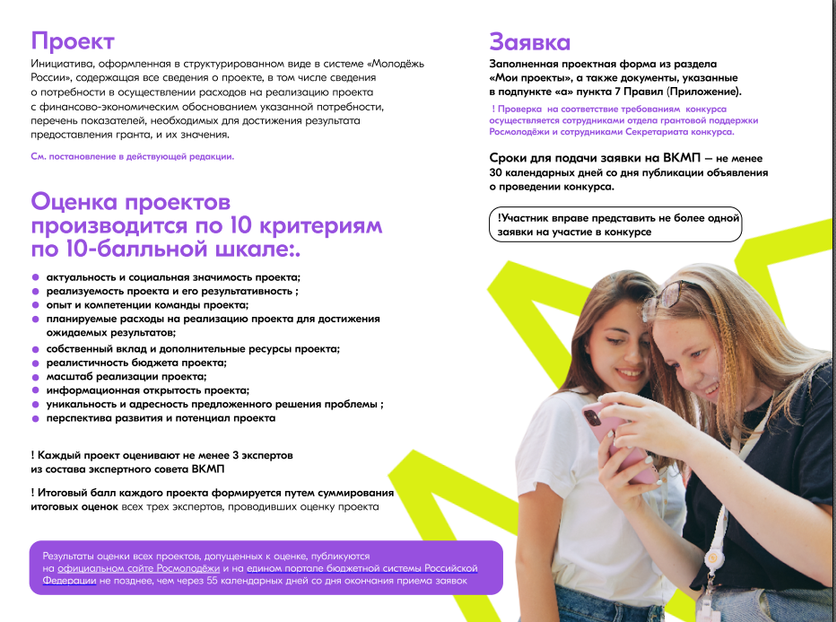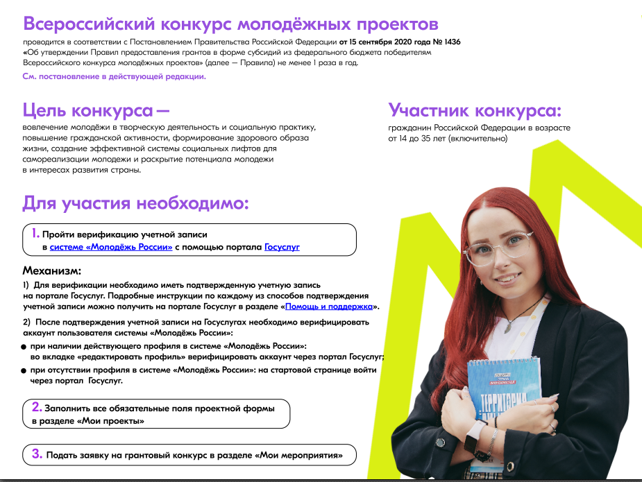19.07.2022Всероссийский конкурс молодёжных проектовпроводится в соответствии с Постановлением Правительства Российской Федерации от 15 сентября 2020 года №1436 «Об утверждении Правил предоставления грантов в форме субсидий из федерального бюджета победителямВсероссийского конкурса молодёжных проектов» (далее – Правила) не менее 1 раза в год.