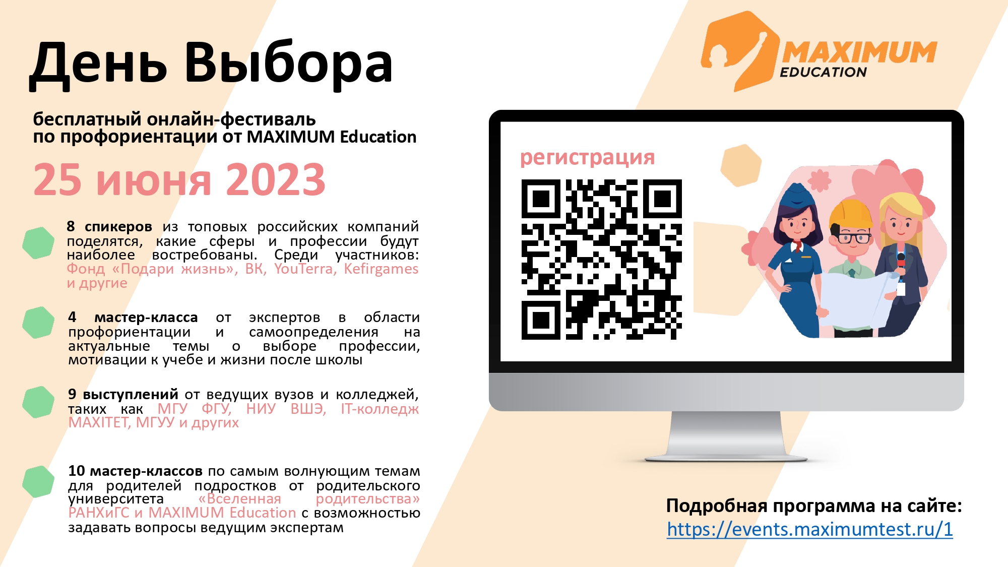 07.06.2023Информируем вас о проведении и возможности принять участие учащимся 5–11 классов и их родителям в бесплатном фестивале по профориентации «День Выбора», который пройдет в онлайн-формате 25 июня 2023 года.