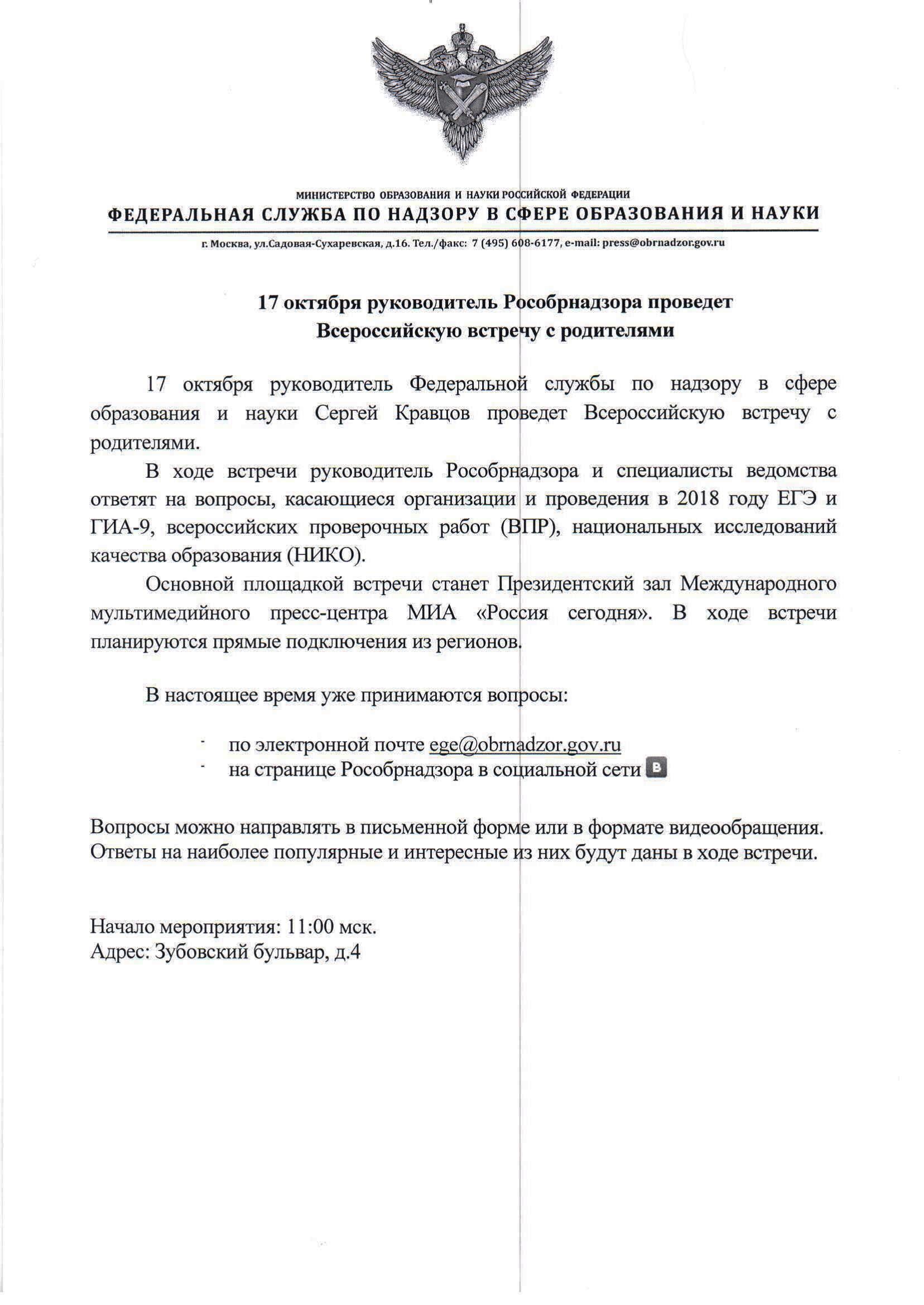 Пошаговый сценарий Всероссийской встречи с родителями руководителя Рособрнадзора Сергея Сергеевича Кравцова