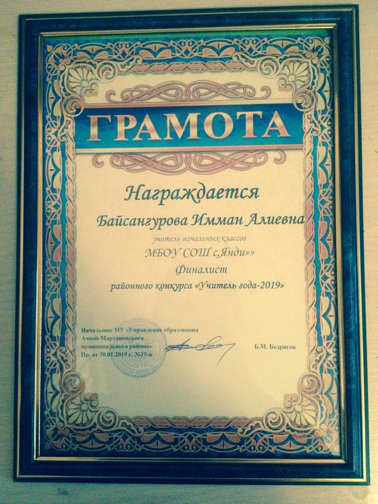Учительница начальных классов Байсангурова И.А стала финалистом муниципального этапа конкурса учитель года.